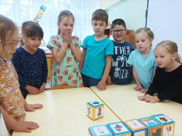 В рамках реализации проекта «Предшкола: стандарт детского сада» на тематической неделе «Мир фантазии и слов» в старшей группе Б проведена увлекательная интерактивная игра с детьми — «Кубики историй».
